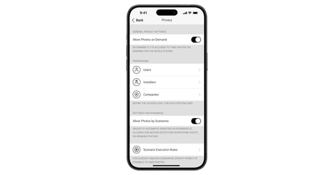 Les applications Ajax utilisent par défaut des codes d’accès, des identifiants biométriques, l’authentification à deux facteurs et le contrôle de session. Une autre couche de protection est le menu Confidentialité : il permet de déterminer quel utilisateur peut accéder aux photos depuis les détecteurs. Les installateurs ou les sociétés de sécurité ne peuvent pas accéder aux paramètres de confidentialité ou aux photos, mais l’administrateur du système peut leur permettre d’utiliser la fonction Photo par calendrier. Par défaut, l’accès à Photo par calendrier est désactivé pour tous les utilisateurs.